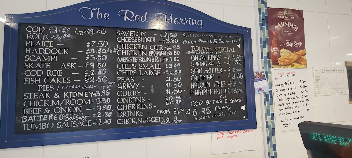 Welcome to Red Herring Fish & Chips, a charming takeaway located at 37A Green St, Sunbury-on-Thames. Renowned for its exceptional fish and chips, this establishment serves freshly cooked dishes that consistently delight customers. Each order of fish is prepared to perfection with a light and crispy batter, ensuring a delightful bite every time. The chips are equally commendable—golden outside and fluffy within, providing the ideal accompaniment.
